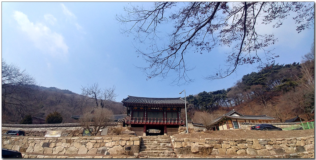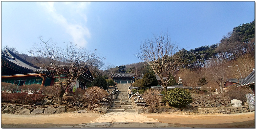 # 대웅전과 좌측에 보이는 영산전이 지역문화재와 보물로 지정되었다 한다. 사찰 입구 우측에 서운산 등산로가 이어져 산을 찾는 이들이 꽤 여럿 보였다.