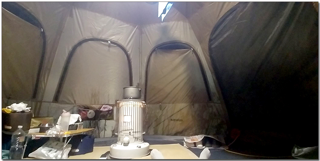 # 우리는 이 쉘터를 좌식으로 사용한다. 가로세로 각각 3.6미터의 중대형이라 쉘터로만 쓸 경우에는 꽤 여러 명이 둘러앉아 놀 수 있을 크기다. 늘 좁은 백패킹용 텐트에서 동계침낭만으로 추위를 견뎠는데 요즘은 난로와 전기장판까지 부르주아가 따로 없다.