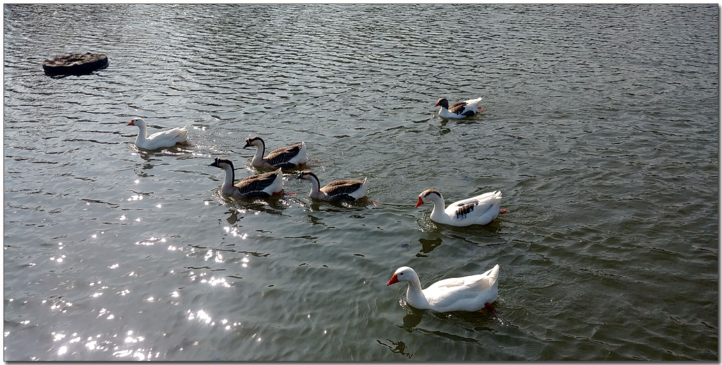 # 건강하고 윤기 흐르는 거위들이 헤엄치고 있다.